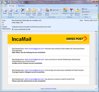 You receive secure e-mails as follows. Detailed instructions on how to open IncaMails can be found at www.incamail.ch/en/secure-email